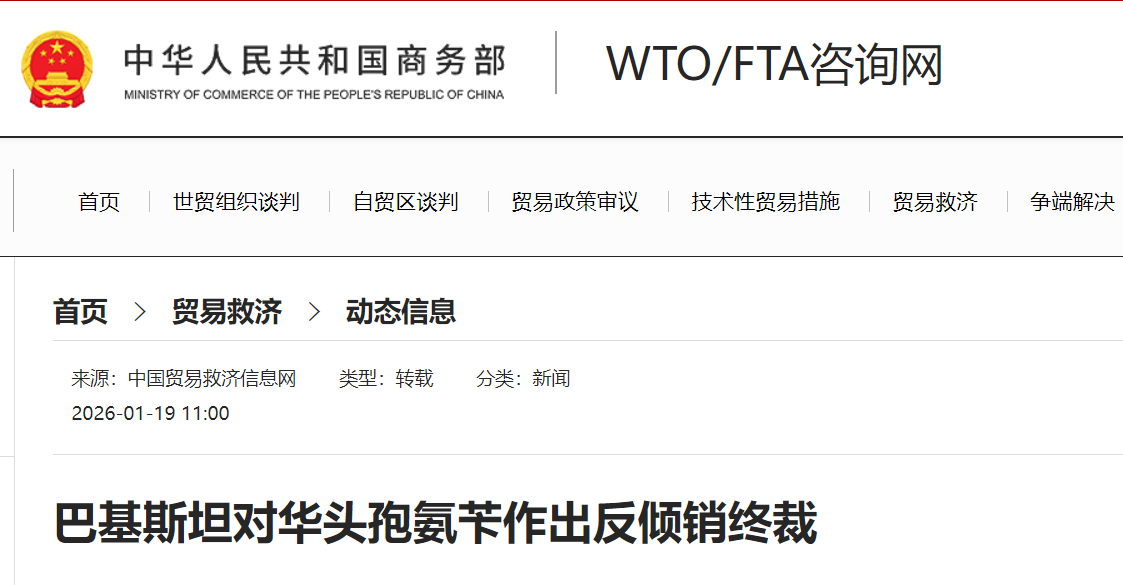 2026年1月14日,巴基斯坦国家关税委员会发布第ADC68号案件的最新公告,对原产于或进口自中国的头孢氨苄(Cefadroxil)作出反倾销肯定性终裁,决定对涉案产品征收反倾销税,具体为生产商/出口商