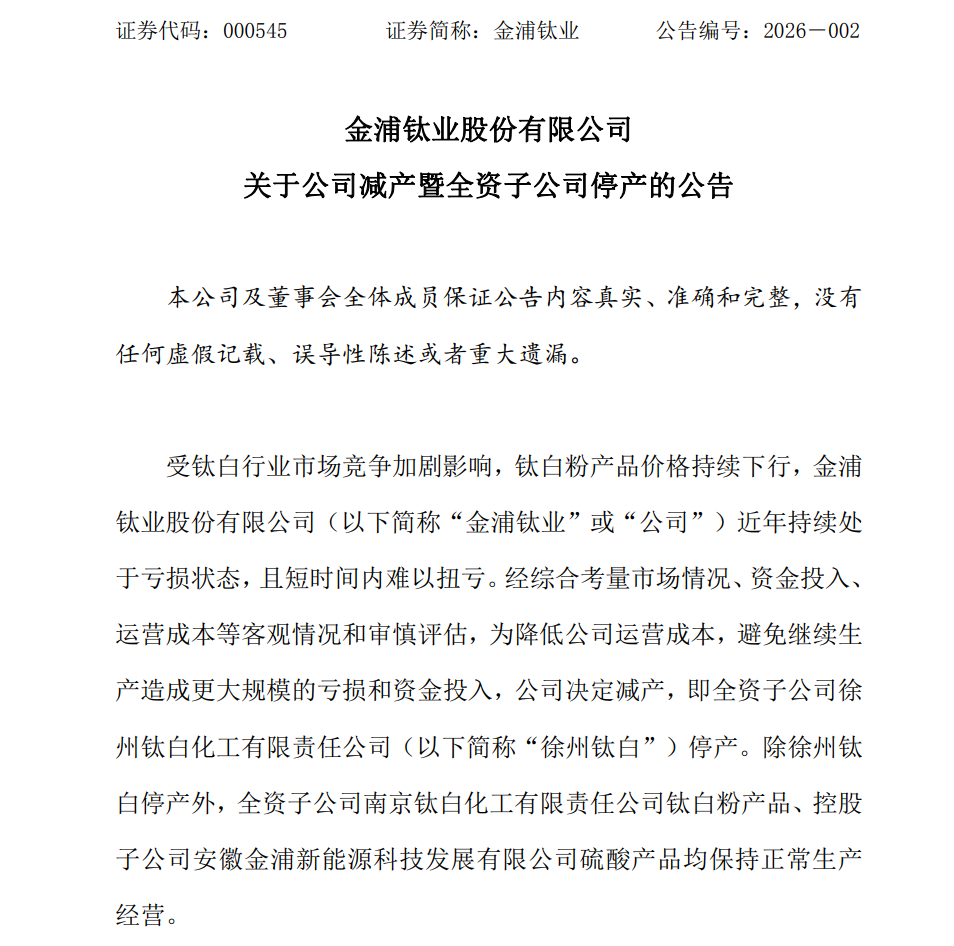 金浦钛业1月16日公告,受钛白行业市场竞争加剧影响,钛白粉产品价格持续下行,公司近年持续处于亏损状态,且短时间内难以扭亏。公司决定减产,即全资子公司徐州钛白化工有限责任公司停产。