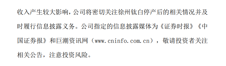 公告称,除徐州钛白停产外,金浦钛业全资子公司南京钛白化工有限责任公司钛白粉产品、控股子公司安徽金浦新能源科技发展有限公司硫酸产品均保持正常生产经营。