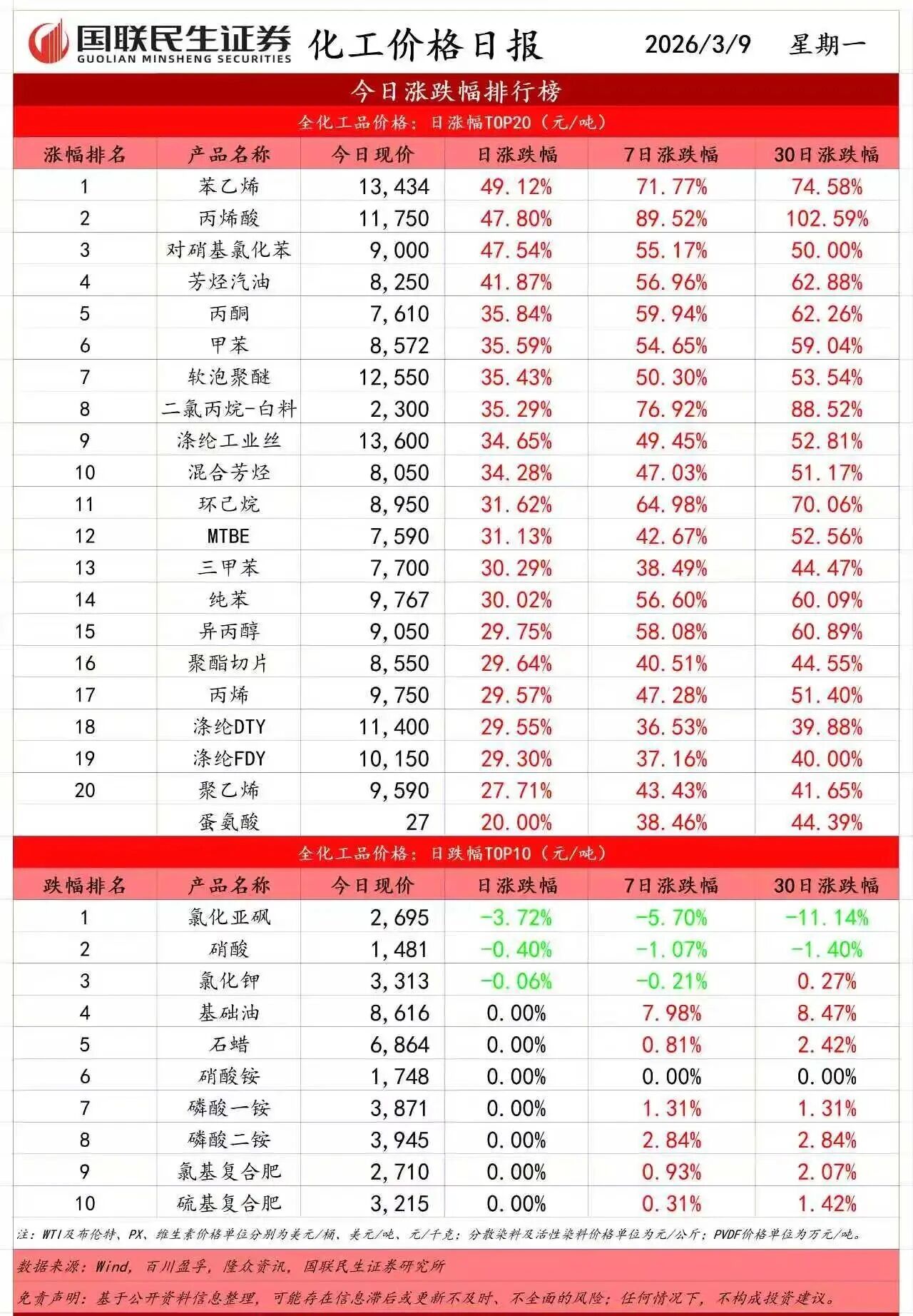 丙烯上涨2860元/吨、丁二烯上涨5700元/吨、MTBE上涨2550元/吨、TBA上涨2700元/吨、苯乙烯上涨4900~5000元/吨、正丁醇上涨2600~2700元/吨、NPG上涨1300元/吨、顺酐上涨2900~3100元/吨、AA上涨4300~4400元/吨、BA上涨3150~3250元/吨、MA上涨1400元/吨、MAA上涨4700元/吨。聚乙烯、PVC系列产品也悉数上涨。