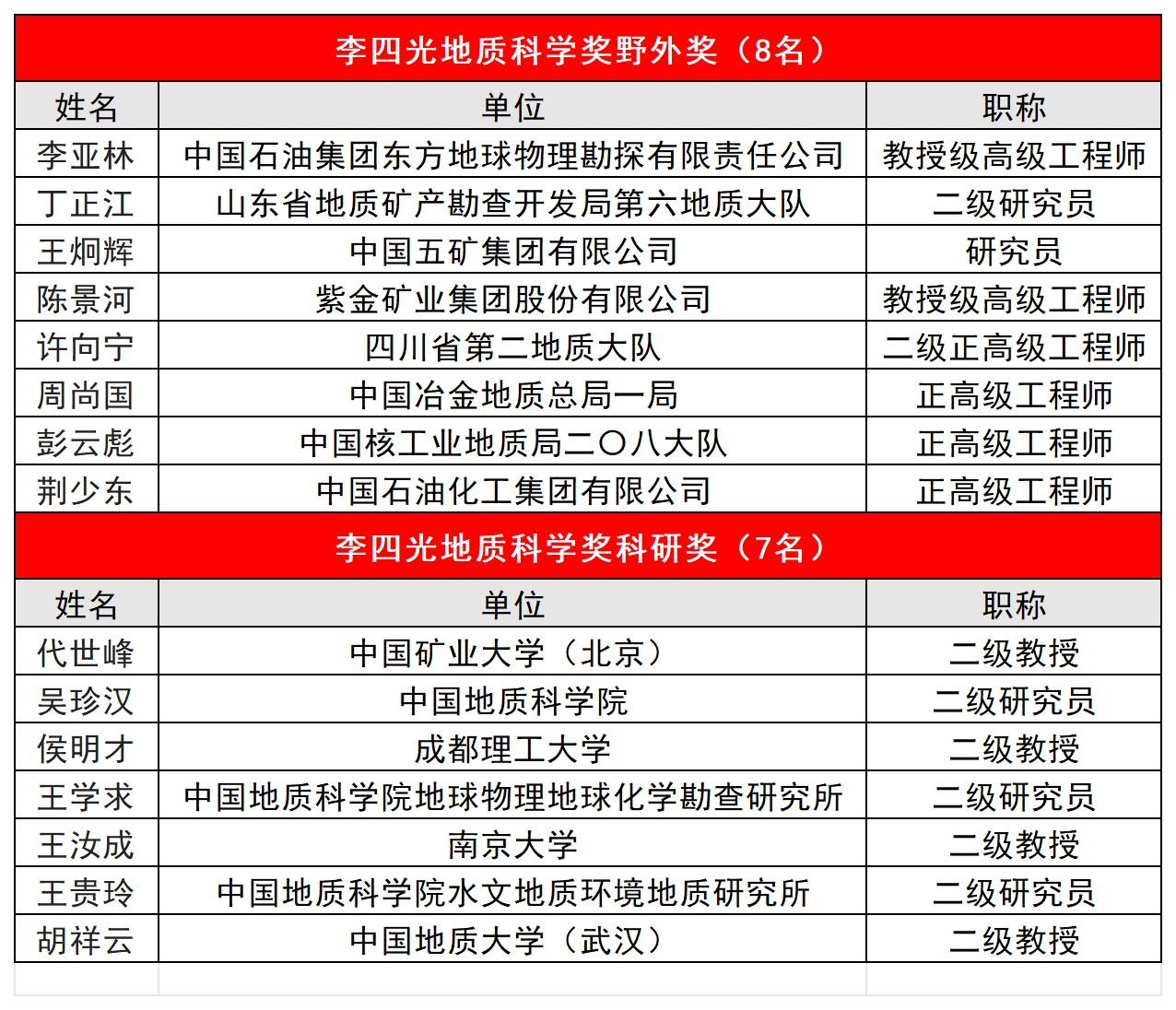 以下是第十九次李四光地质科学奖完整名单: