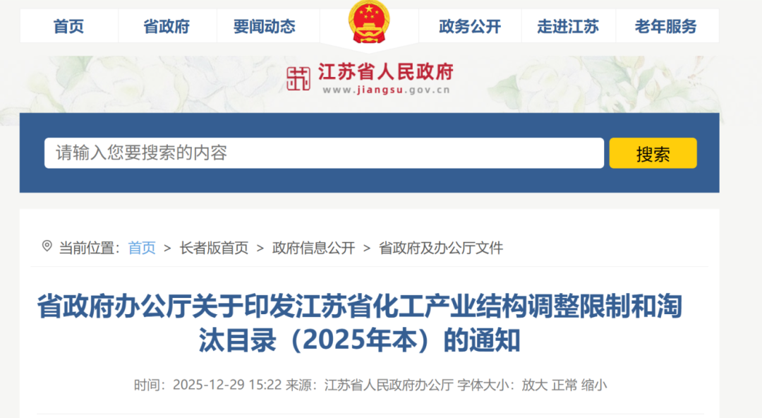 近日,江苏省政府办公厅关于印发江苏省化工产业结构调整限制和淘汰目录(2025年本)的通知,其中限制类16项,淘汰类18项。