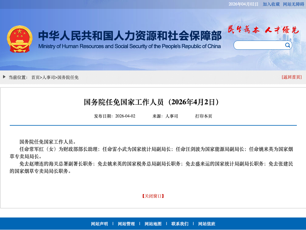 中华人民共和国人力资源和社会保障部网站4月2日消息,国务院任免国家工作人员: